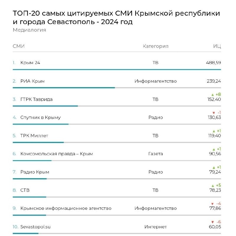 📢 Телеканал «СТВ» стал самым цитируемым СМИ в Севастополе за 2024 год Медиарейтинг ушедшего года представил портал «Медиалогия». Телеканал «СТВ» не только вошёл в ТОП-10 цитируемых СМИ в Крыму и Севастополе, но и стал первым среди медиа города-героя. По сравнению с 2023 годом «СТВ» поднялся в рейтинге на пять мест вверх. 📺 Подписывайтесь на СТВ