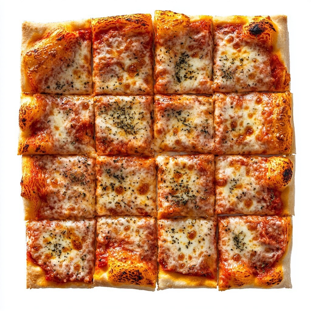 Создано на основе запроса: Inviting photo of square pizza cut into square slices, isolated, white background, photo for advertising