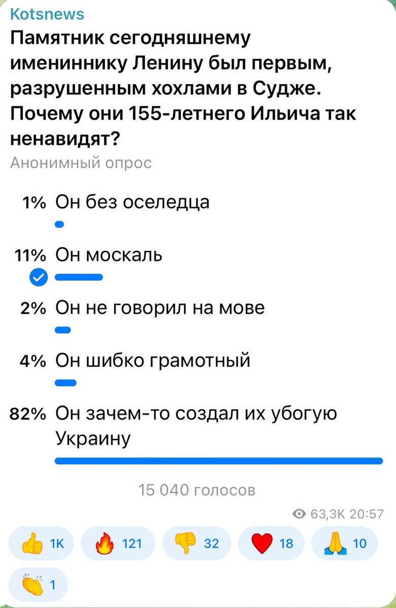 ⚡️⚡️⚡️ 82 процента проголосовавших считают, что украинцы не любят Ленина за то, что государственность у них появилась только при нем. А не при древних украх, как пишут в нынешних учебниках по украинской истории.