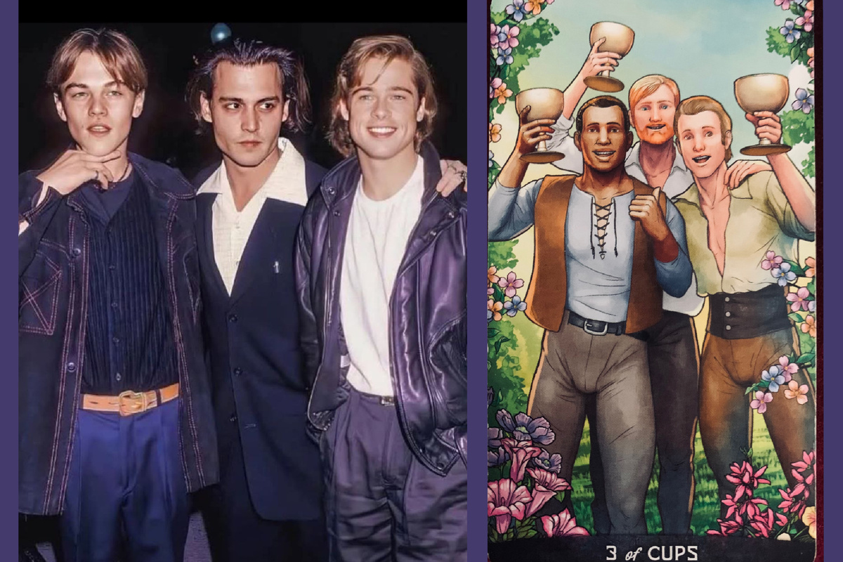 Такие молодые и такие классные Леонардо Ди Каприо, Джонни Депп и Брэд Питт позируют для репортеров. Впереди у них еще много интересных работ в кино и они радостно смотрят в будущее. Они звезды Голливуда и кумиры многих. В этом кадре — чистая энергия Тройки Кубков: бурная молодость, дружба и праздник души!