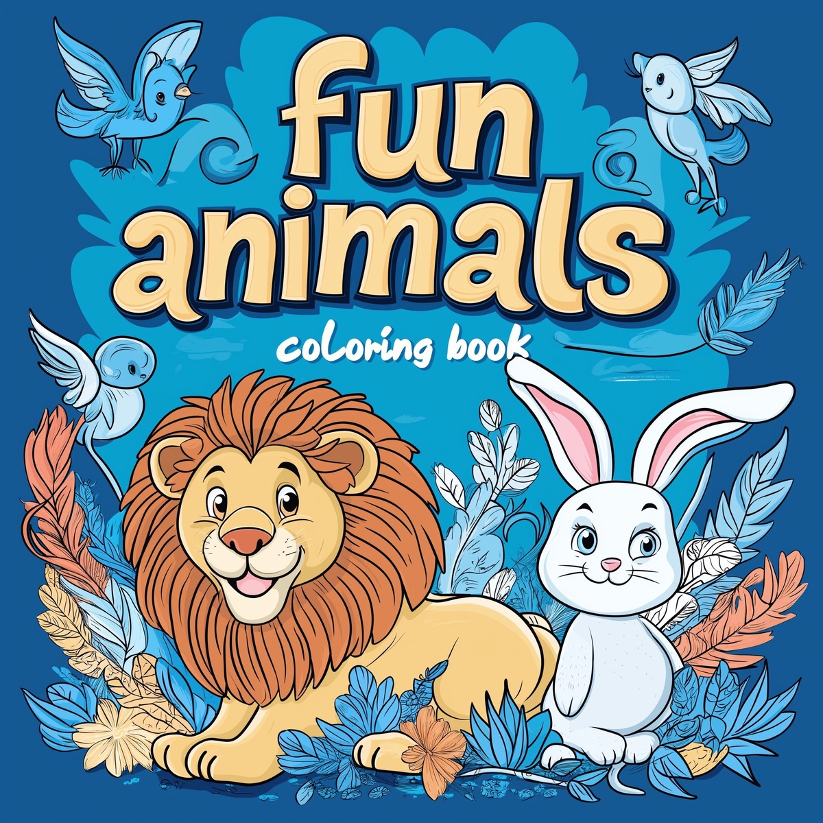 Создано на основе запроса: a cover design for a kids coloring (lion , bunny, cut)playful font for the title "fun animals coloring book