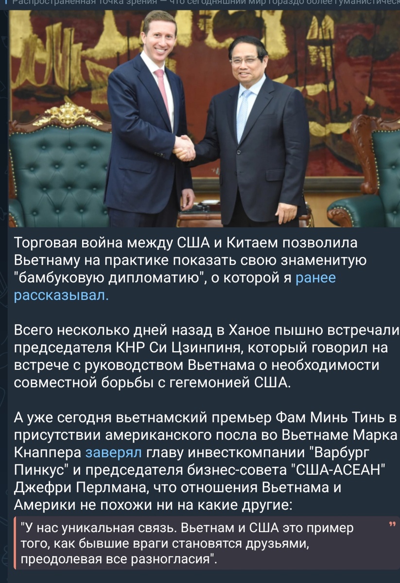 Недавно прошли переговоры Вьетнама с китайскими и американскими партнёрами. Царев назвал это "бамбуковой дипломатией".