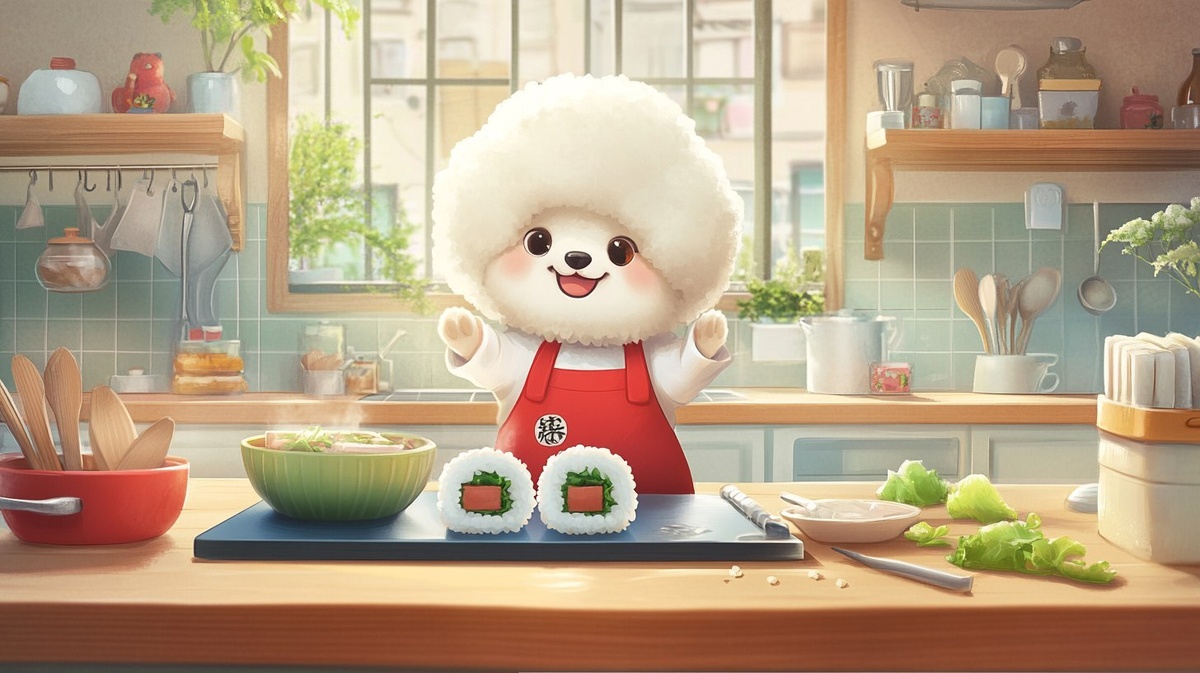 Создано на основе запроса: triangle kimbap cooking scene, same style, cute bichon frise dog chef, red apron, cartoon kitchen, soft pastel