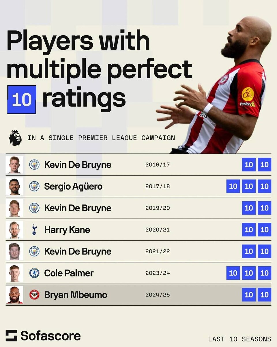 Бриан Мбемо блестяще показал себя в матче 33-го тура АПЛ: он отдал голевую и оформил дубль, чем серьезно помог «Брентфорду» оформить победу со счетом 4:2 над «Брайтоном». Портал SofaScore, специализирующийся на футбольной статистике, оценил перфоманс полузащитника на максимальные 10 баллов. Мбемо получает от портала наивысшую оценку второй раз за сезон – это один из лучших результатов лиги за последние годы. Эксперты SofaScore вспомнили игроков, которые за одну кампанию в АПЛ несколько раз получали от портала максимальную оценку. Рекордсменами оказались Серхио Агуэро (в сезоне-2017/18) и Коул Палмер (в сезоне-2023/24) – оба трижды за кампанию проводили идеальные матчи. Отметим Кевина де Брюйне, который попал в рейтинг по результатам трех разных сезонов. Рекордсмены по идеальным матчам в одном сезоне АПЛ Данные по последним 10-ти сезонам Мбемо успеет провести еще две безупречные игры и стать абсолютивным рекордсменом? 😎 Пора... Предварительная команда сезона АПЛ Олисе и Рафинья – лидер