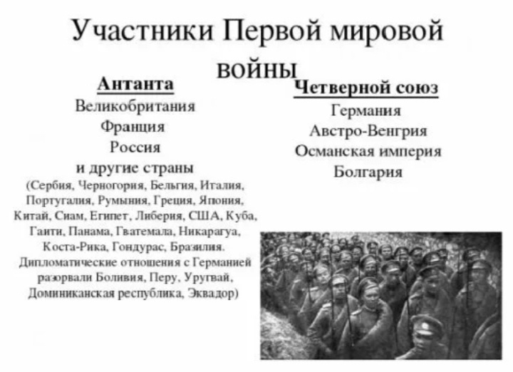 **Первая мировая война (1914–1918): Основные события, даты и последствия** **Причины войны:** - Милитаризм, империализм, национализм и система военно-политических союзов. - Тройственный союз (Германия, Австро-Венгрия, Италия) противостоял Антанте (Франция, Россия, Великобритания). - Непосредственный повод: убийство австрийского эрцгерцога **Франца Фердинанда** 28 июня 1914 года в Сараево боснийским сербом Гаврило Принципом. **Хронология войны** **1914 год** - 28 июля: Австро-Венгрия объявляет войну Сербии. - 1 августа: Германия объявляет войну России. - 3 августа: Германия объявляет войну Франции и вторгается в Бельгию. - 4 августа: Великобритания вступает в войну. - Сентябрь: Битва на Марне — Франция останавливает немецкое наступление на Париж. - Август: Битва при Танненберге — разгром русской армии Германией на Восточном фронте. **1915 год** - Апрель: Османская империя начинает геноцид армян. - Февраль–декабрь: Дарданелльская операция (Галлиполи) —