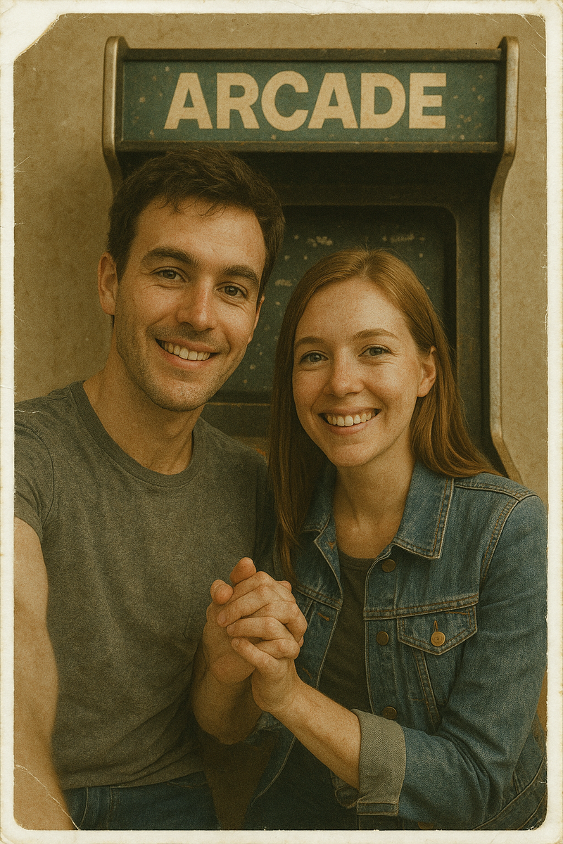 Художник сразу почувствовал настроение: на картине Андрей и Аня — оба в виде пиксельных персонажей, с огромными глазами, в шлемах-сердечках, чуть неуклюжие, но очень живые. Вокруг — платформы, как в любимых играх: первый уровень — «Переезд», второй — «Ссора и примирение», третий — «Ремонт кухни», четвёртый — «Совместная кошка». В углу — счётчик жизней, а рядом надпись: "2P mode: forever".