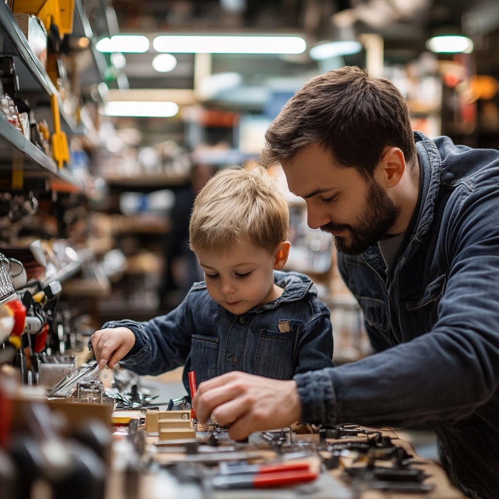Создано на основе запроса: Padre mira a su hijo pequeño jugar con llavero en la tienda de herramientas ar 16:9
