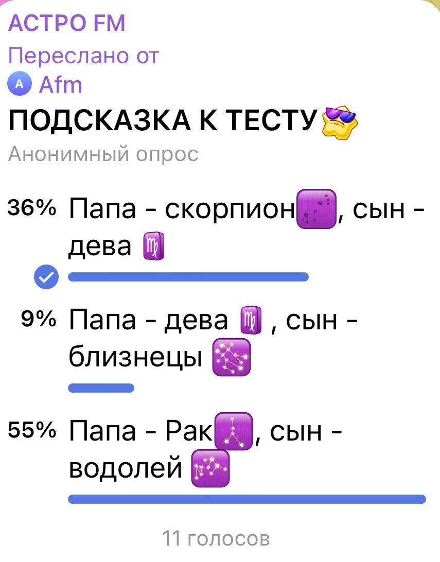 🔥🔥🅱️🔥🔥 на АСТРОТЕСТ Все молодцы, кто принял участие и размял свои мыслительные зоны🤩😔 Правильный вариант - 1️⃣ Папа-скорп на низких вибрациях это не про активное слушание и ДИАЛОГ, это ОТВЕТ БЕЗ ОТВЕТА, обесценивание и колкости, на своей глубокой волне - -Ты, сынок, спрашивай, но отвечать ПОЧЕМУЧКЕ-Деве ♍️ он не собирался! Умняха-сын смекнул настрой папаши. Дети-девы любят задать 100500 вопросов, не потому они хотят вас за@бать, а потому что они составляют свою энциклопедию жизни, свой толковый словарь. И если на свой вопрос, они не получат ответа, вырастет недоверчивое существо бензопила «НЕдружба» 😬 Скорпион ♏️ любитель манипулировать, проявлять свою силу и давление - кто Ж тебе ещё, кроме отца, объяснить? Усиление и подчеркивание своего влияния, а это присуще скорпу, одной буковкой 🔥 напрочь отобьёт желание ребенка общаться. Именно в таких ситуациях дети-девы, и без того неуверенные, получают прививку выученной беспомощности. И это СТРАШНО! Такие взрослые дети потом