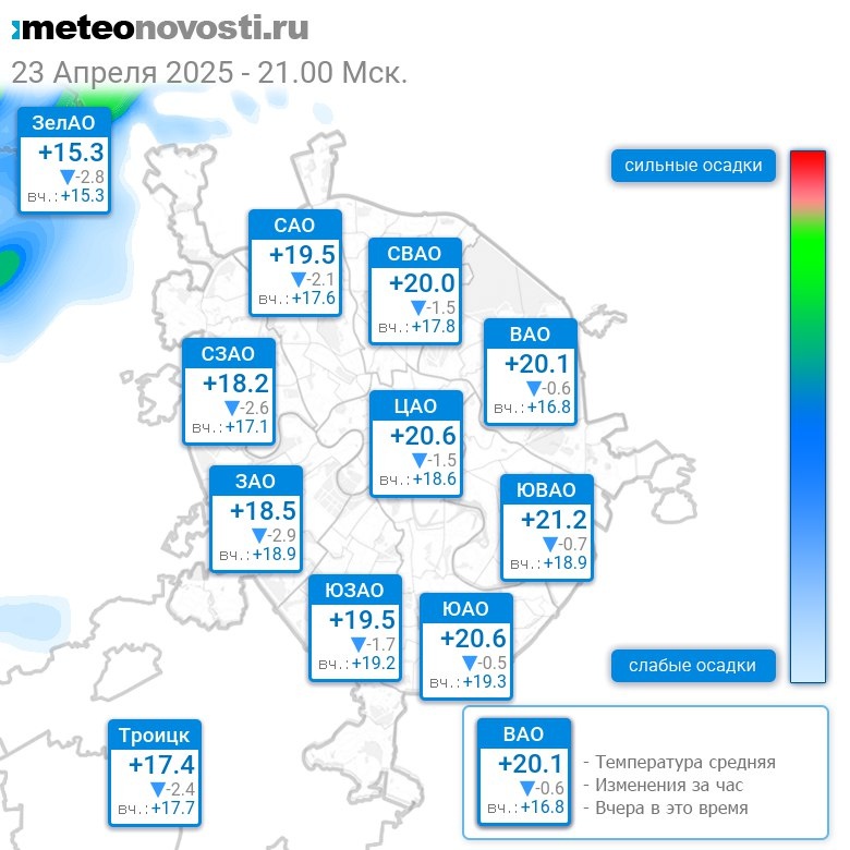 В 21:00 в Москве было от +14.8°C до +21.3°C, средняя температура +19.3°C #погода #Москва #весна #температура #23апреля #среда