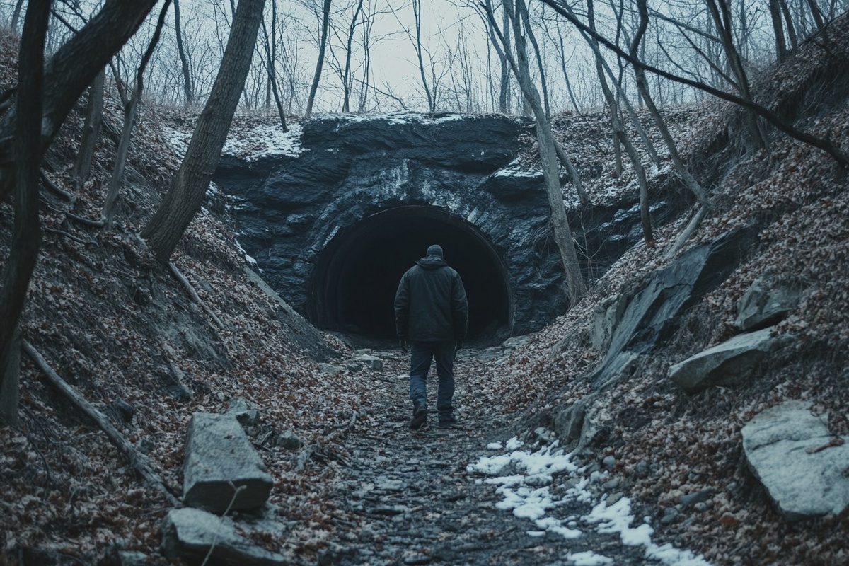 Создано на основе запроса: A maintenance worker is sent to inspect a century-old tunnel that was sealed after a series of disappearances