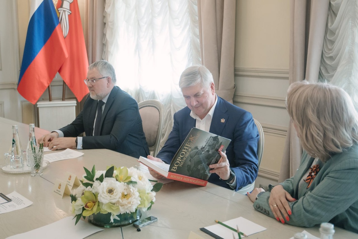 Сегодня провёл встречу с представителями общероссийской общественной организации «Союз писателей России». Обсудили проведение выездного заседания секретариата Союза, которое стартовало в Воронеже и посвящено 80-летию Победы. В программе заседания — встречи писателей с ветеранами и участниками СВО, литературные вечера и диалог с молодёжью. В ходе встречи поговорили о том, как литература помогает сохранять историческую правду, формировать патриотизм у молодёжи и укреплять духовные ценности. Поблагодарил ответственного секретаря Союза писателей России Николая Иванова за выбор Воронежа для проведения выездного заседания. Это признание роли нашего региона в сохранении памяти о Великой Отечественной войне. Конечно же, очень рад был в очередной раз пообщаться с Иваном Афанасьевым — заведующим кафедрой русской и мировой литературы Гомельского госуниверситета, внучатым племянником Героя Советского Союза генерал-майора Александра Лизюкова. Он также участвует в выездном заседании секретариа