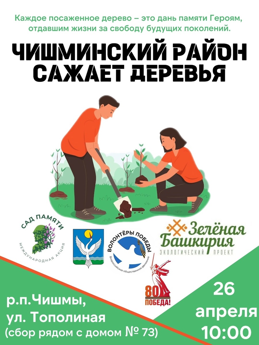 26 апреля жители Чишминского района соберутся на улице Тополиной, чтобы высадить сосновую аллею в рамках Всероссийских акций «Сад памяти» и «Зеленая Башкирия». В эту субботу, 26 апреля, в р.п. Чишмы пройдет важное экологическое мероприятие — посадка деревьев в рамках Всероссийских акций «Сад памяти» и «Зеленая Башкирия». Акция приурочена к 80-летию Победы в Великой Отечественной войне 1941-1945 годов и направлена на сохранение памяти о подвиге наших предков. Каждое посаженное дерево станет символом уважения, благодарности и памяти о мужестве и стойкости поколения, прошедшего через испытания войны. Высадка сосновой аллеи, которая станет новым зеленым украшением поселка, состоится на улице Тополиной. Сбор участников назначен на 10:00 рядом с домом №73 по улице Тополиной. Организаторы просят приходить с лопатами и ведрами, чтобы вместе внести свой вклад в обустройство и озеленение родного края. Мероприятие рассчитано на активное участие жителей всех возрастов. Это прекрасная возможность с