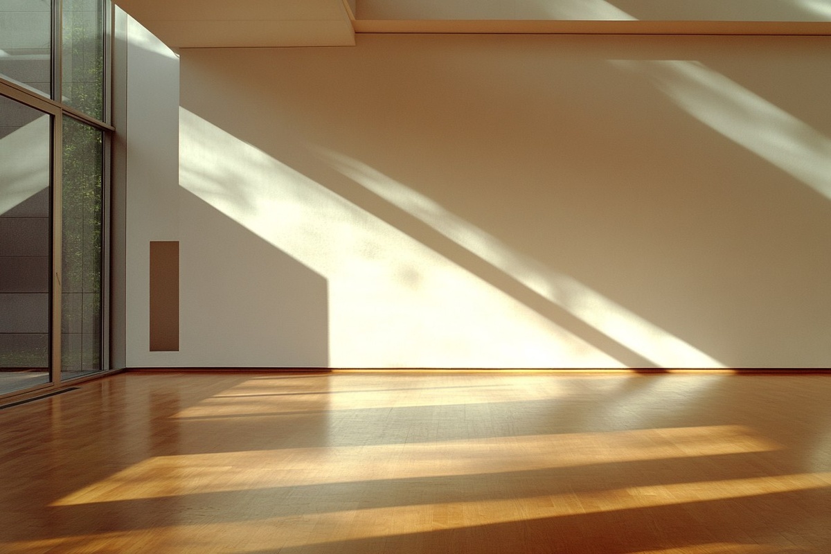 Создано на основе запроса: wall of empty room, white wall, mahogany flooring, sunshine shadows