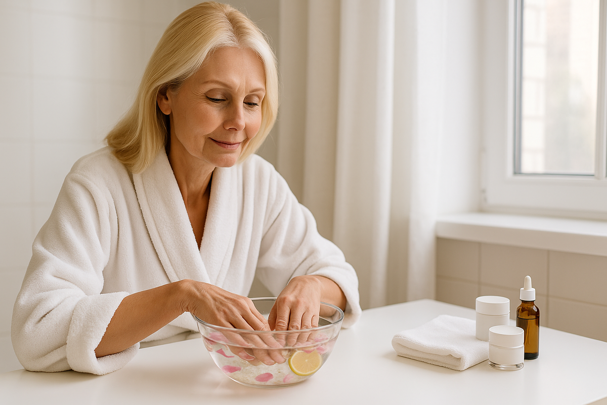 Мы ухаживаем за лицом, выбираем кремы, маски, массажи — а руки остаются «на потом». Но именно руки чаще всего выдают возраст. Тонкая кожа, сухость, пигментация, потеря упругости… И всё это усугубляется с возрастом, когда снижается уровень коллагена и естественная защита кожи. Хорошая новость — вернуть рукам мягкость и ухоженный вид можно и дома. Без салонов. Без дорогих процедур. Главное — регулярность и немного внимания. 5 шагов к ухоженным рукам — легко и приятно 1. Тёплые ванночки: базовая забота Ванночки не просто расслабляют — они подготавливают кожу к увлажнению и улучшают кровообращение. Как делать: Польза: смягчение кутикулы, снятие сухости, релакс для всего тела. 2. Домашняя маска — как спа у себя дома Простой рецепт: Почему работает: