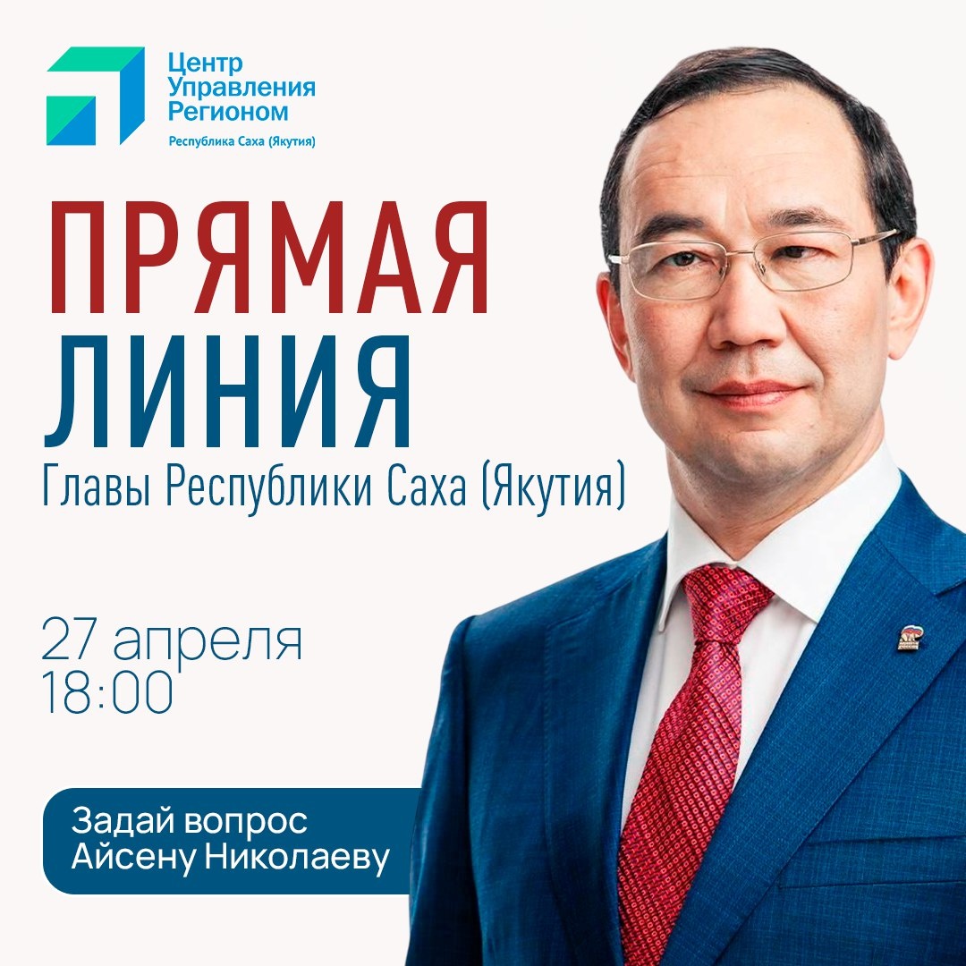 В День Республики Саха (Якутия) 27 апреля в 18.00 состоится «Прямая линия» Главы Якутии Айсена Николаева В прямом эфире Глава Якутии ответит на актуальные вопросы жителей республики, расскажет о стратегических направлениях и новых задачах по развитию региона. Сбор вопросов для прямой линии начинается уже сегодня! Центр управления регионом Якутии принимает вопросы и предложения жителей республики в чат-боте в Telegram @voprosGlaveYakutii_bot. Кроме того, их можно озвучить по круглосуточному номеру 8 (4112) 506-006. Трансляцию эфира смотрите 27 апреля в 18.00 на телеканалах «НВК Саха», «Якутия 24», «Россия 24», слушайте на радио «Тэтим», «Радио России», «Виктория Саха», «СТВ-радио» и в социальных сетях Айсена Николаева.