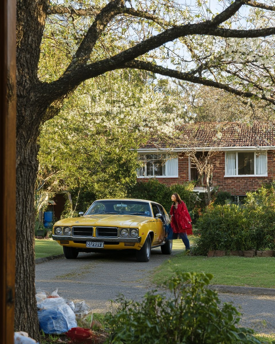 Создано на основе запроса: A yellow muscle car parked on the driveway of in a residential suburb lined with trees on a warm morning. A woman is coming out of the car. Downshot taken from the second storey inside the house. Editorial photography, beautiful spring morning light, in the style of Hasselblad X2D. --- Автоперевод: Желто -мускулистая машина, припаркованная на подъездной дорожке в жилом пригороде, выложенном деревьями теплым утром. Классно получилось? 🤔 https://dzen.ru/id/65c0c65c86e4f837c27b24d7 #ИИ #AI #нейросеть #midjourney #art