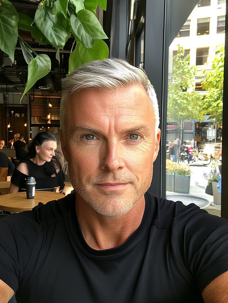Создано на основе запроса: selfie of a middle-aged Caucasian man, 55-60 years old, appearing 45-50, masculine but approachable, short silver hair, healthy clear skin, no face wrinkles, no eye wrinkles, no forehead wrinkles, no signs of aging, subtle relaxed smile, no sunglasses, no cap, no accessories, solo male selfie only, taken casually using the iPhone front-facing camera, arm partially visible, no phone in hand, seated at a window inside a cozy cafe, no other human inside the cafe, warm light and indoor plants visible, sharp focus, f/30 simulation, no bokeh --- Автоперевод: Селфи кавказского мужчины среднего возраста, 55-60 лет, появляясь 45-50, мужские, но доступные, короткие серебряные волосы, здоровые чистые кожи, без морщин для лица, без глазных морщин, без морщин в лбу, нет признаков старения, тонкой расслабленной улыбки, без солнечных м Круто выглядит? 🤔 https://dzen.ru/id/65c0c65c86e4f837c27b24d7 #ИИ #AI #нейросеть #midjourney #art
