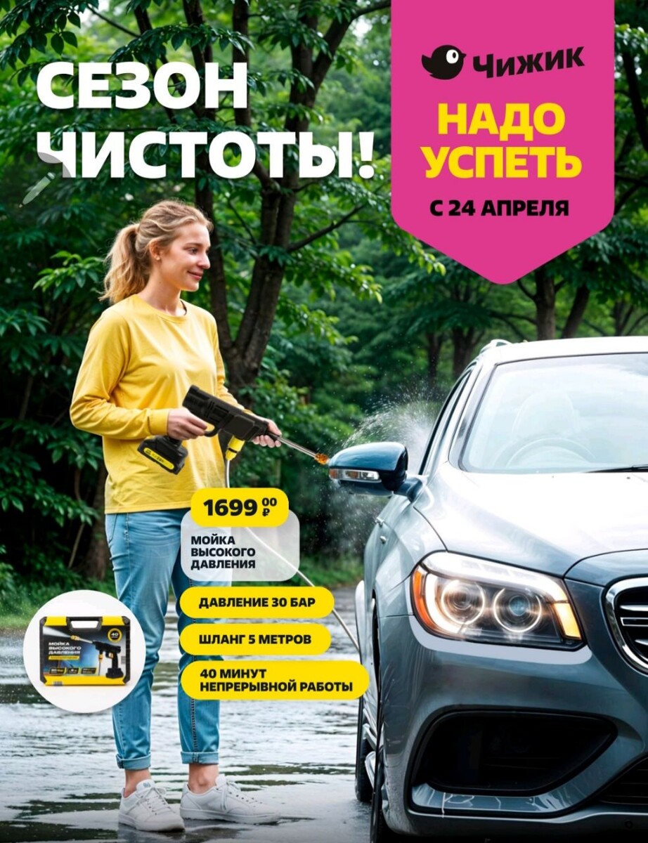 Мойка высокого давления 1699р, причем аккумуляторная, и для нее не требуется давление воды в системе и еще того хуже - удлинитель с розеткой на улице под рукой; т.е. просто кидаем 5м шланг в бочку с водой или ведро, и 40 мин можно создавать вокруг чистоту, используя 3 различных насадки и удлинительную трубку.