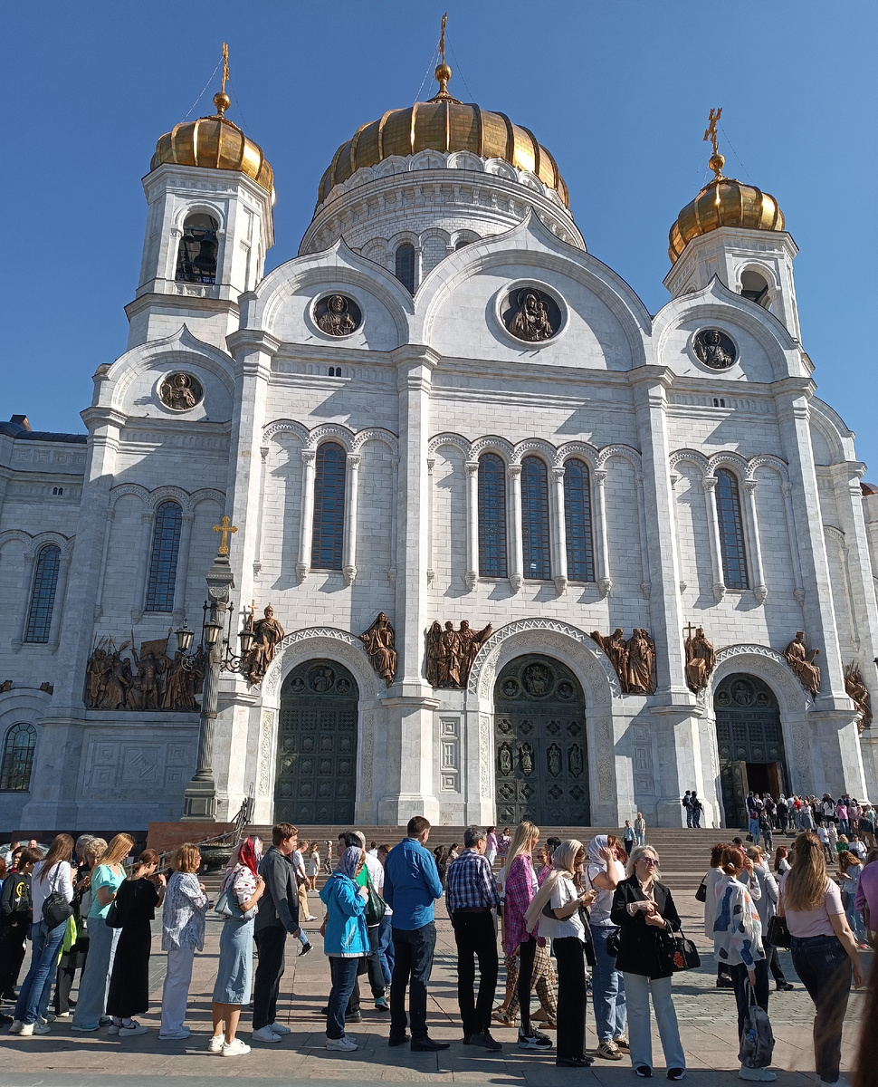 23 апреля 2025 года Здравствуйте, друзья! В Светлое Христово Воскресение насладившись прогулкой на речном трамвайчике, мы с подругами решили не забывать о духовном и посетить один из главных московских храмов - Храм Христа Спасителя. Добраться до храма совсем просто, он находится рядом с метро Кропоткинская, только наверх подняться. А вот попасть туда не просто совсем, очередь из желающих посетить храм обвивала его со всех сторон. Но и около храма было на что посмотреть. Украшен он был к светлому празднику с большим московским размахом. Я не очень сильна в праздничной православной атрибутике, мне даже показались украшения избыточными, но людей, разглядывающих всё это праздничное убранство было очень много, все так спешили сделать фото на фоне цветов, лент и пасхальных яиц, что и мы быстро отставили в сторону сомнения в уместности всего этого декора и стали разглядывать его элементы. А посмотреть было на что. Напротив входа протянулась огромная арка из цветов, лент и висящих на лентах