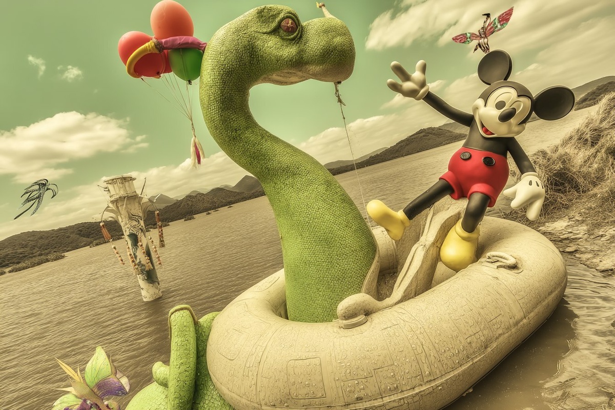 Создано на основе запроса: An imaginative and playful scene featuring the Loch Ness Monster having a blast with Mickey Mouse, set in a