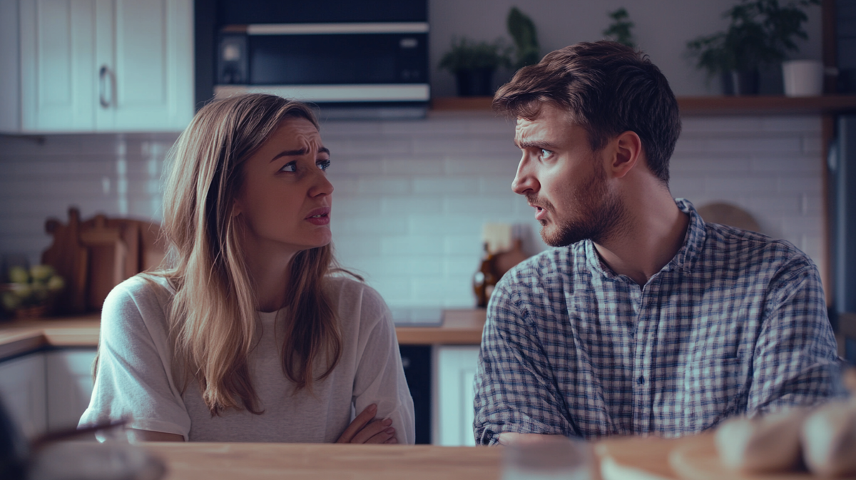 Денис, стоя на кухне с чашкой кофе в руках, посмотрел на неё с недоумением. Его лицо исказилось от удивления и обиды.