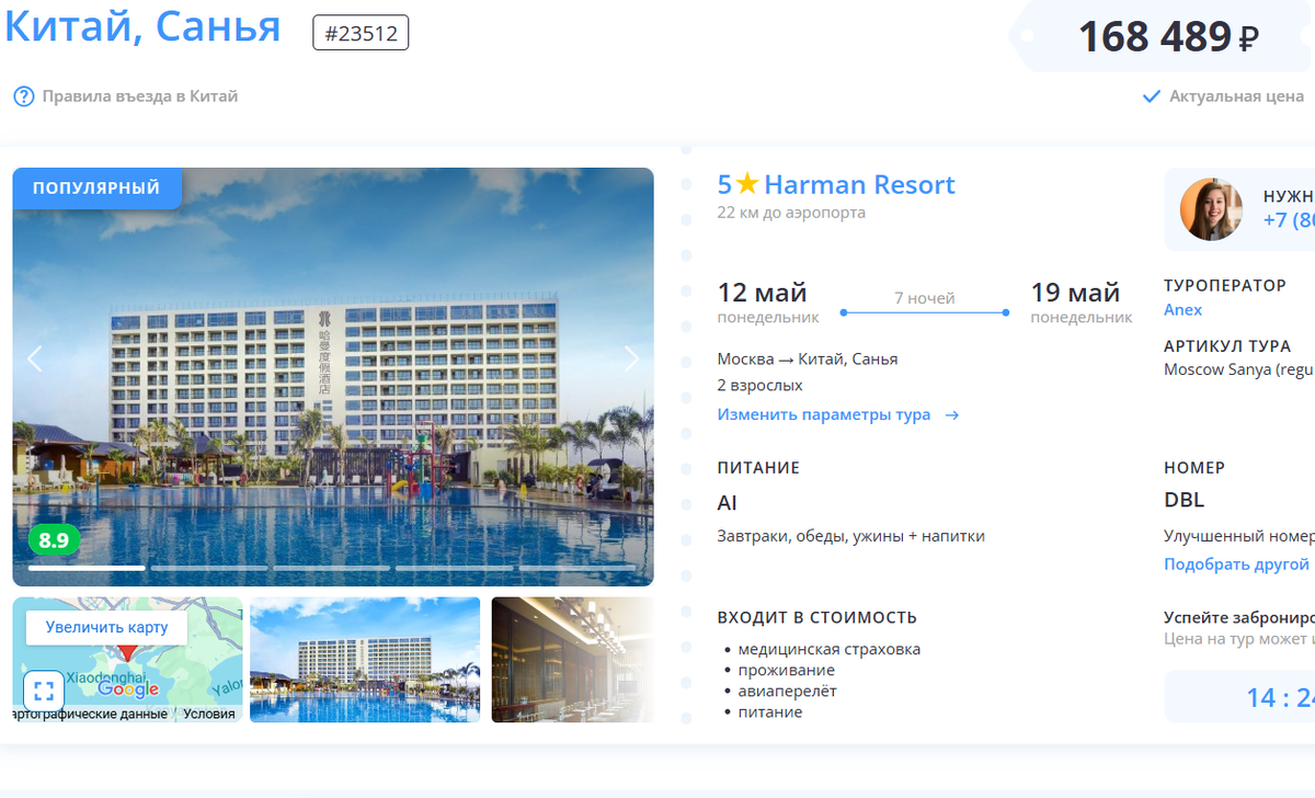 Теперь смотрим, сколько выходит Харман (Harman Resort Hotel Sanya) 5* на HB (завтрак и ужин)