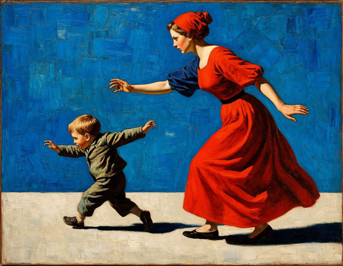 Ребенок убегает от матери накануне Великой Октябрьской Социалистической Революции