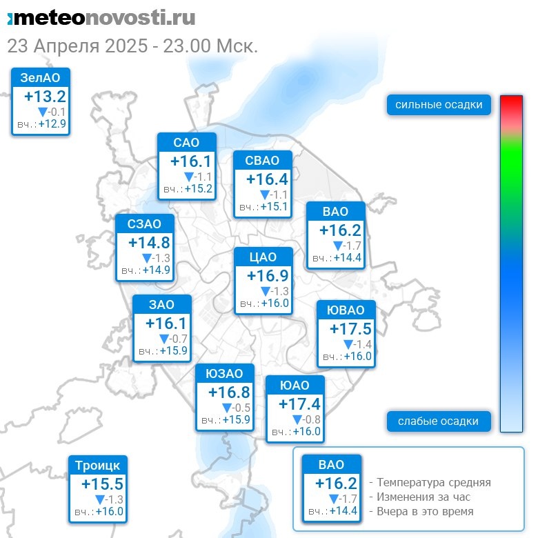 В 23:00 в Москве было от +13°C до +17.7°C, средняя температура +16.1°C #погода #Москва #весна #температура #23апреля #среда Перейти на сайт Прогноз погоды на 14 дней