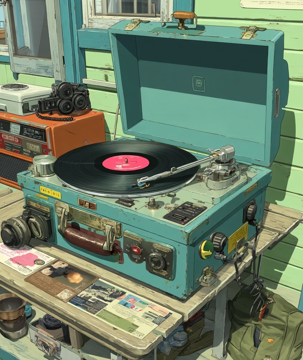 Создано на основе запроса: A close-up of an old-fashioned record player with vinyl records, set in the living room of the "Bathhouse" from Studio Ghibli's Spirited Away anime movie. The background is a wooden table and green walls. There should be no characters or any other elements to emphasize the focus on details. In the style of Studio Ghibli's signature cute anime style. --- Автоперевод: Крупным планом старомодного проигрывателя с виниловыми пластинками, расположенным в гостиной «Баня» из аниме-фильма Studio's Speristed Away Away Away. Отлично вышло? 🤔 https://dzen.ru/id/65c0c65c86e4f837c27b24d7 #ИИ #AI #нейросеть #midjourney #art
