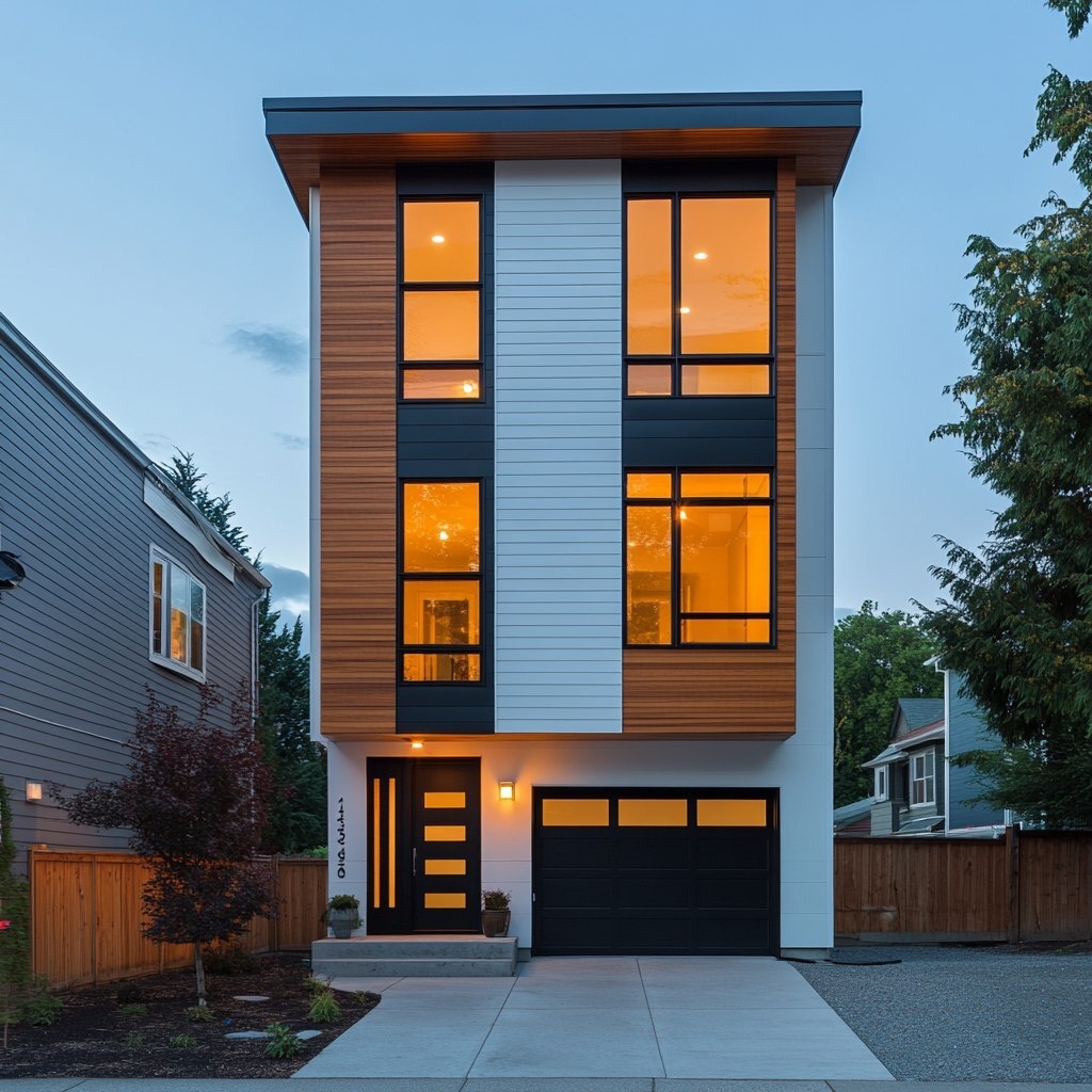 Создано на основе запроса: A narrow three story townhouse in Everett, Washington in a residential neighborhood
