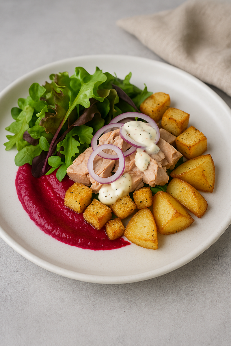 > Есть блюда, которые не просто утоляют голод, а пробуждают воображение и дарят настоящее удовольствие. Наш салат с печенью трески — именно такое! --- Почему этот салат заслуживает вашего внимания Представьте себе: вы подносите к губам вилку и первое, что чувствуете — нежный взрыв вкуса. Хруст микрозелени, бархатистая мягкость печени трески, лёгкая кислинка свекольного пюре и аппетитный аромат хрустящих сухариков и запечённого картофеля. Каждый компонент будто бы рассказывает историю, и вместе они создают шедевр, достойный ресторанного меню. --- Идеальный баланс текстур и вкусов Свекольное пюре (50 г) — его яркий цвет и нежная структура задают тон всему блюду. В каждой ложке — сладковатая земляная нота. Печень трески (50 г) — это не просто консервированный продукт, а деликатес с бархатистой текстурой и «морским» привкусом, который идеально сочетается с остальными ингредиентами. Микс салатов (30 г) — свежая зелень с лёгкой горчинкой создаёт контраст и добавляет хрусткости. Картофель «ст