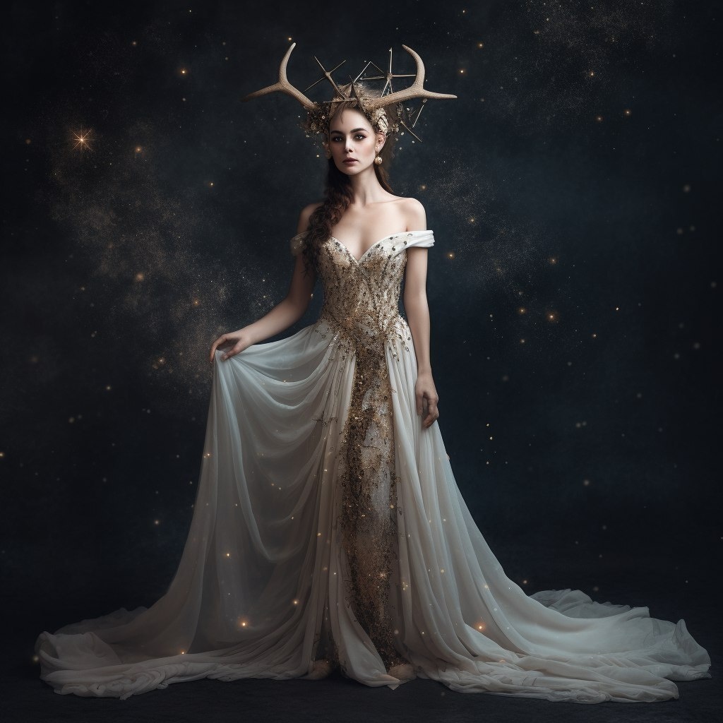 Создано на основе запроса: a beautiful goddess wearing an ethereal crown and a flowing dress in the cosmos amid the new moon in taurus