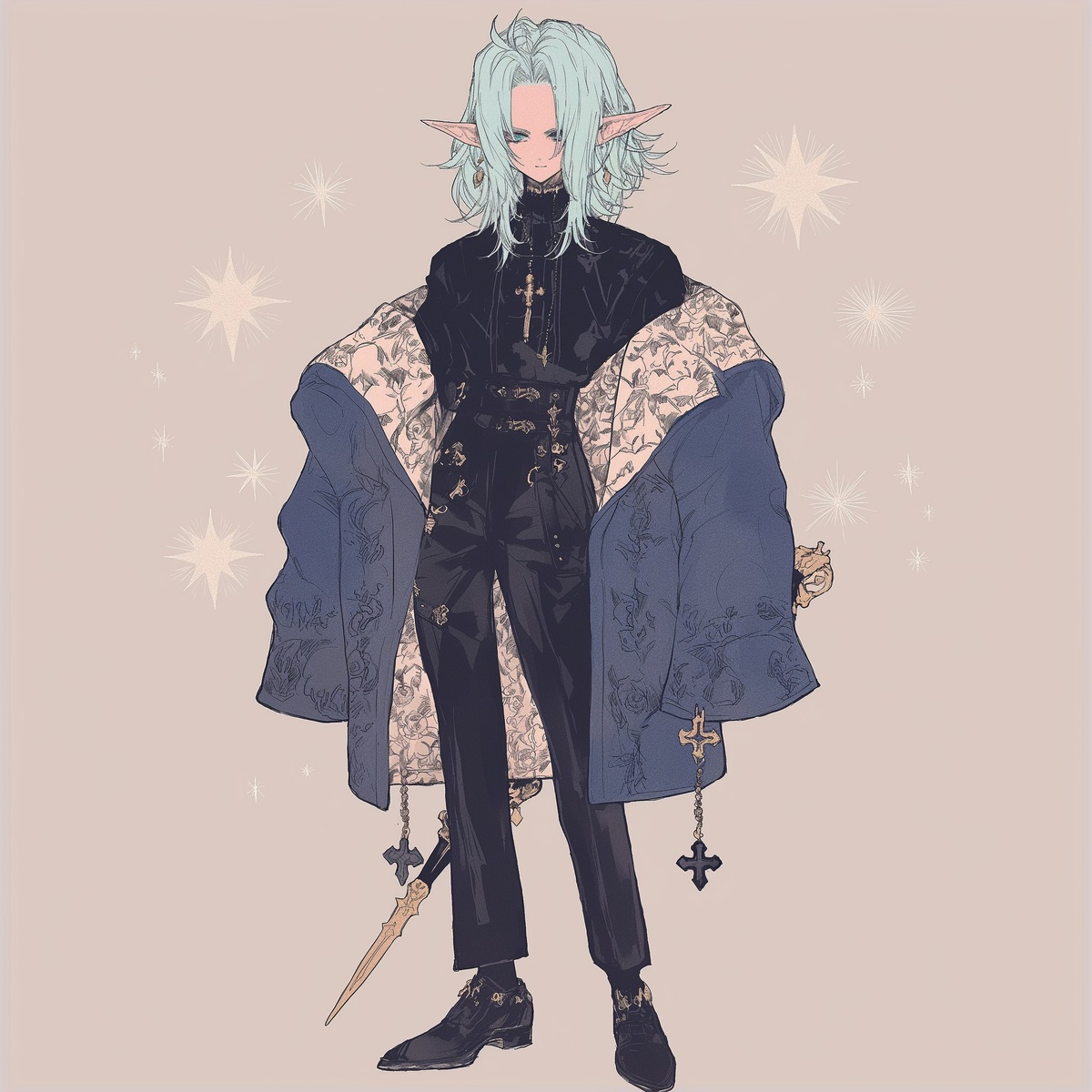 Создано на основе запроса: Standing at full height is a male elf with mint hair and dark blue eyes in a luxurious patterned suit