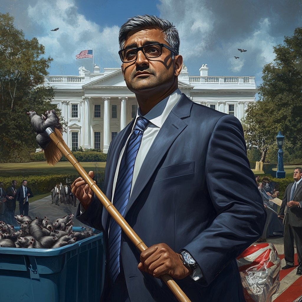 Создано на основе запроса: realistic FBI director Kash Patel with a broom and sweeping rats in a trashcan, the White House in the background