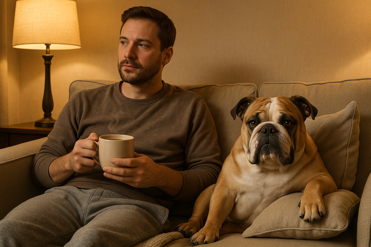 «Сделайте так, чтобы сразу было понятно, кто тут главный. Только не я — Барни. Пусть будет видно, что он тут всё решает». На фотографии, которую он прислал художнику, всё было по-честному: Виктор в домашних трениках, с чашкой чая, уютно устроился на диване. А Барни — на подушках, развалился с достоинством, как будто вот-вот позвонит дворецкий. Лапа лежит на подушечке, морда серьёзная, взгляд — будто оценивает, достойно ли заварен чай. В этот момент даже Виктору стало ясно: Барни выглядит солиднее любого аристократа. «Давайте сделаем нас лордами, — предложил Виктор. — Я — в фраке, Барни — в монокле. Пус