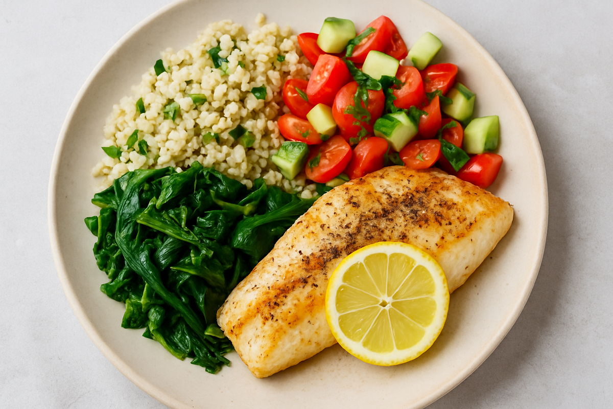 Средиземноморский обед за 20 минут: рыба, зелень и крупы на одной тарелке