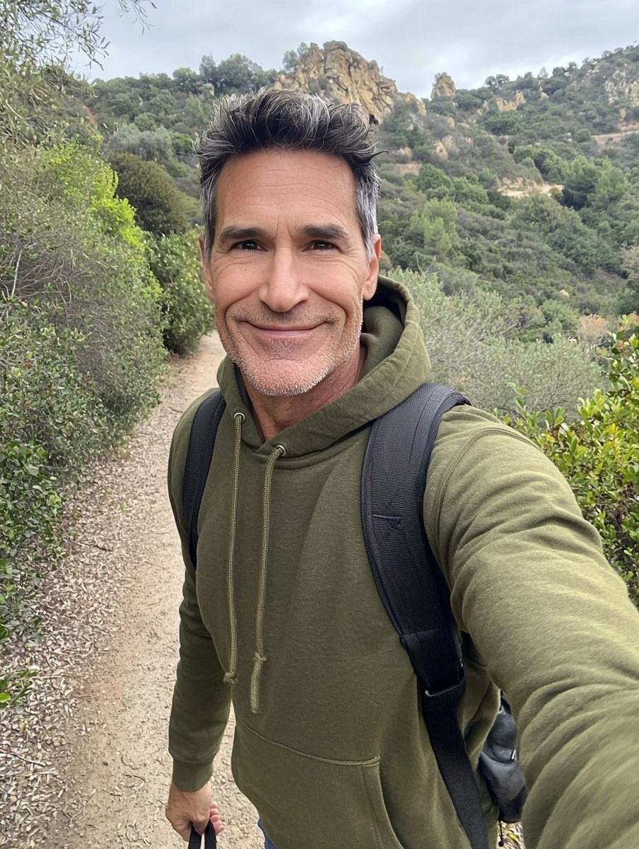 Создано на основе запроса: candid selfie of a 56-year-old Caucasian man who looks 46, rugged yet approachable look, no wrinkles, short