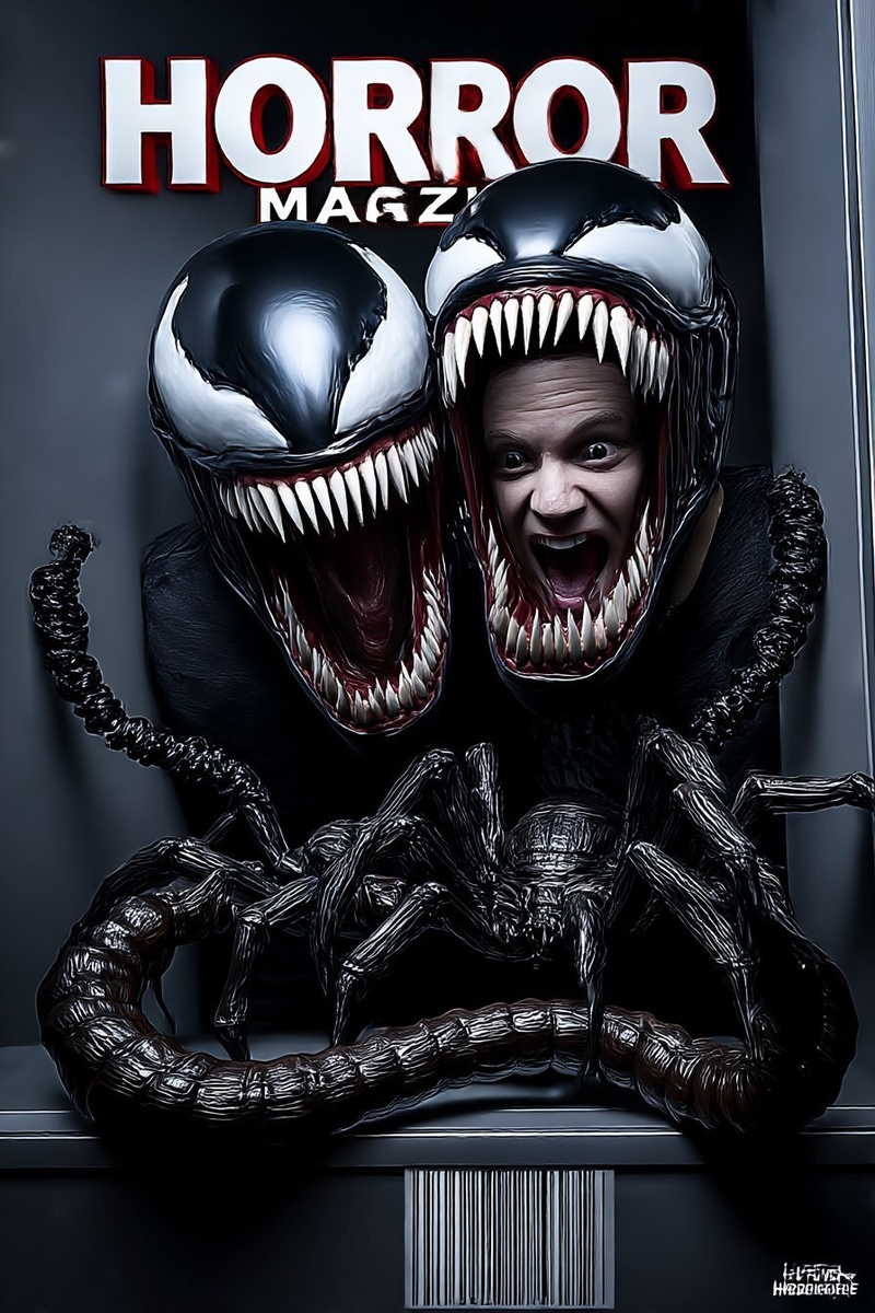Создано на основе запроса: magazine cover with the words, "HORROR" "MAGAZINE" typeset on top of page. main image: a horror themed photographic creation made of monstrous horrible spider fangs and hideous thorny xenomorph heads and curly pigtails and camel spiders and giant centipedes and rattlesnake tails, barcode placed lower left corner, hyperrealistic --- Автоперевод: Обложка журнала со словами, журнал «Ужас» «Журнал» на вершине страницы. Красиво получилось? 🤔 https://dzen.ru/id/65c0c65c86e4f837c27b24d7 #ИИ #AI #нейросеть #midjourney #art