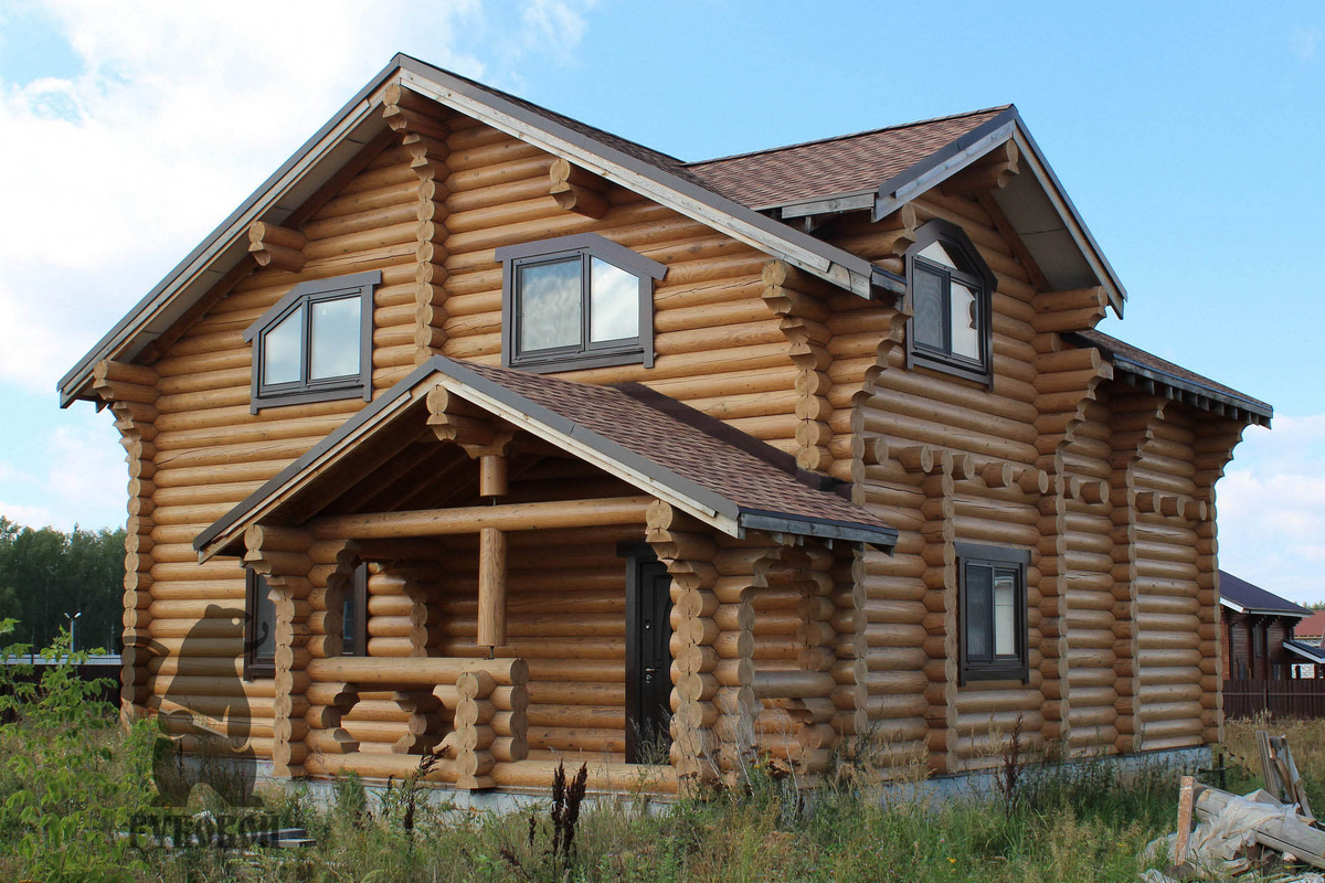 Загородный дом из бревна для проживания небольшого количества человек с большим комфортом. Ставшая уже классической архитектура в европейском стиле с крышей крестом, соответственно двумя большими фронтонами и двумя поменьше, называемыми «кукушками» или «фонарями», а так же 2 входа.