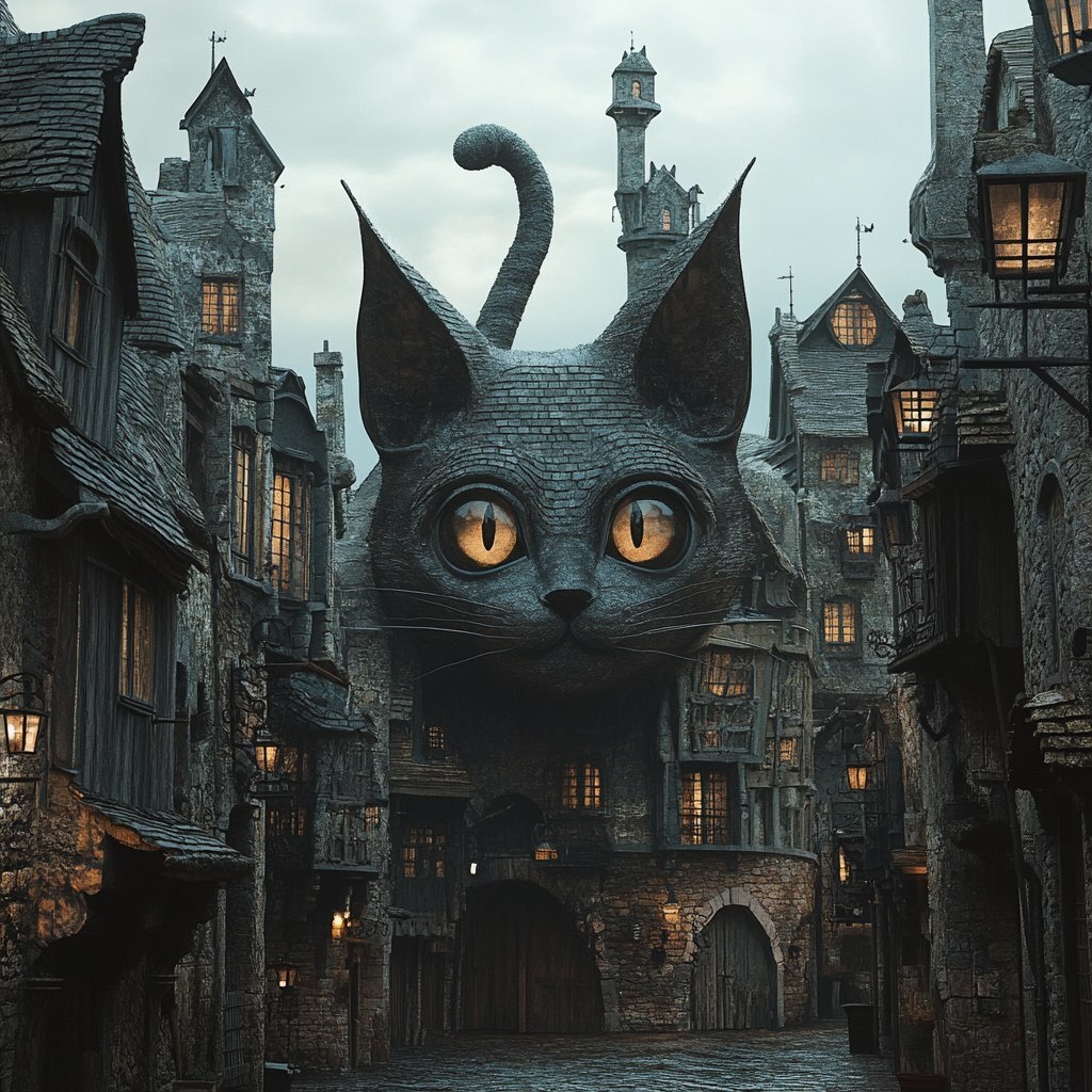 Создано на основе запроса: a street with cat shaped gothic buildings