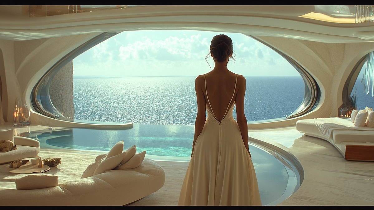 Создано на основе запроса: movie scene, a beautiful luxurious lounge that is very modern and airy. The back of a very elegant woman can be seen as she looks out of the large window over the ocean view --- Автоперевод: Сцена фильма, красивая роскошная гостиная, которая очень современная и просторная. Как тебе эта картинка? 🤔 https://dzen.ru/id/65c0c65c86e4f837c27b24d7 #ИИ #AI #нейросеть #midjourney #art