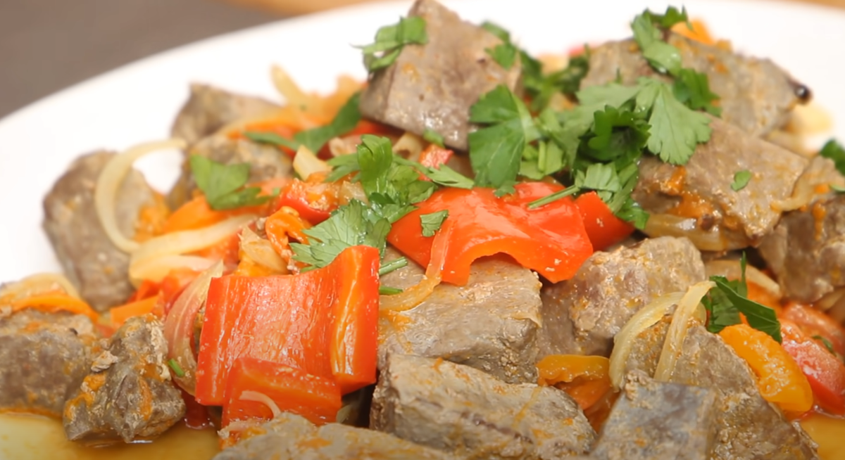 Чтобы приготовить это блюдо, вам понадобятся 1 кг печени, 2 луковицы, 1 острый перец, 2 помидора, 3 болгарских перца, а также зелень и специи.