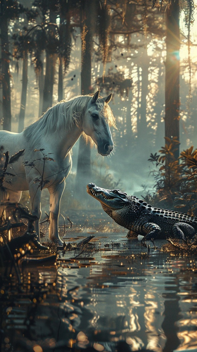 Создано на основе запроса: a white horse and a crocodile, both full-body, standing face to face at a distance on flat ground, wide-angle view, fully visible from head to toe, misty forest background, dramatic cinematic lighting, ultra detailed, 9:16 TikTok format