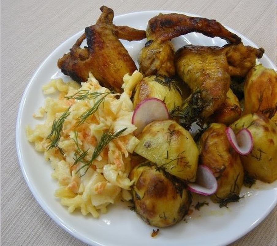 Крылышки натираем специями, купаем в маслице, перемешиваем с любовью. Отправляем в холодильник на 20 минут – пусть подумают о своем поведении. 2. Картофельная миссия.