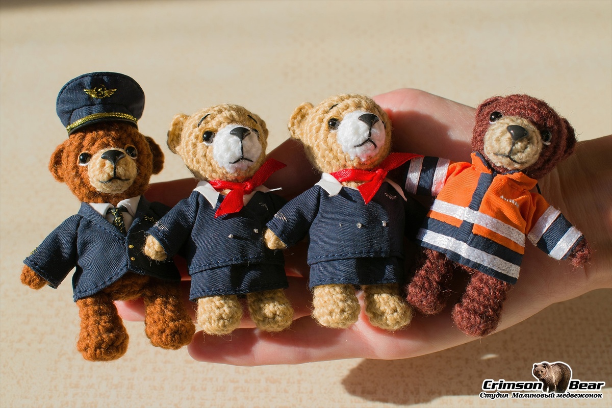 Размер мишек 7 см. Связаны из шерстяной пряжи. Носики выполнены из запекаемой пластики и покрыты лаком.Костюмы сшиты вручную, символика вышита серебристой и золотистой нитью. Наземная служба Аэрофлота