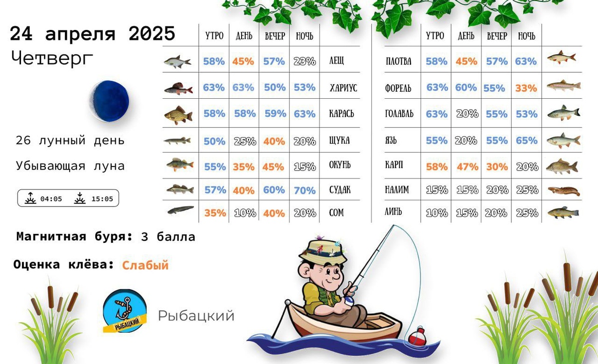 ‼️Прогноз клёва на 24 апреля по фазе и состоянию луны