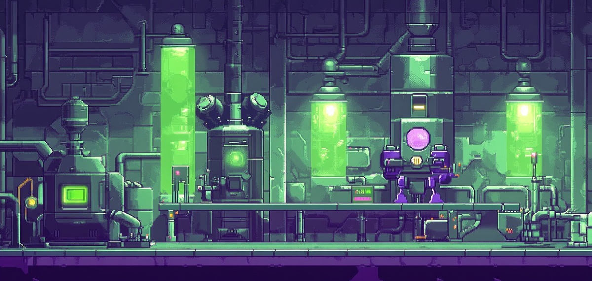 Создано на основе запроса: Mega Man 8-bit low res interior chemical factory themed game level, green and purple chemicals, with chemical