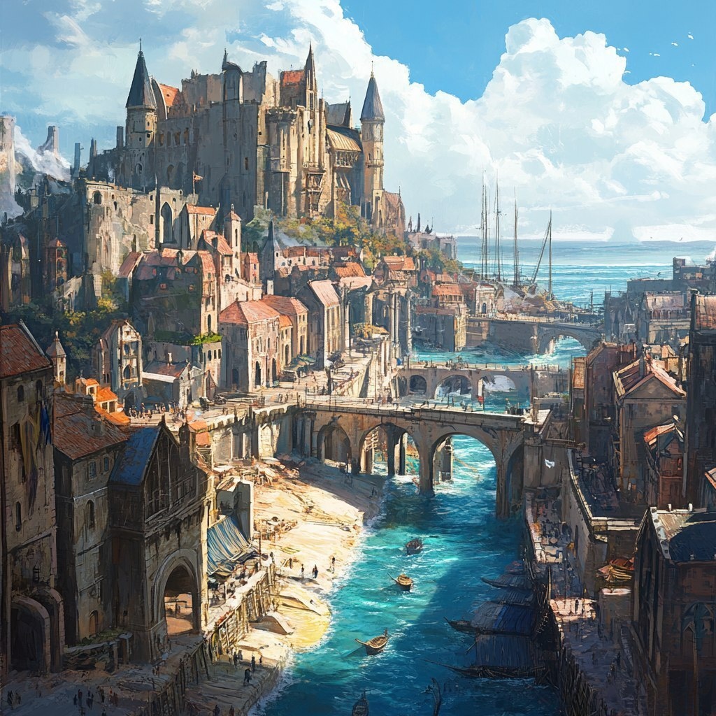 Создано на основе запроса: A Ocean-side mideval City. A large Citadel stands out in the city. There are aquaducts running through the city streets. It has a bright and sunny atmosphere. There is construction going on in places. --- Автоперевод: Средневековой город Океансайд. Необычно выглядит? 🤔 https://dzen.ru/id/65c0c65c86e4f837c27b24d7 #ИИ #AI #нейросеть #midjourney #art