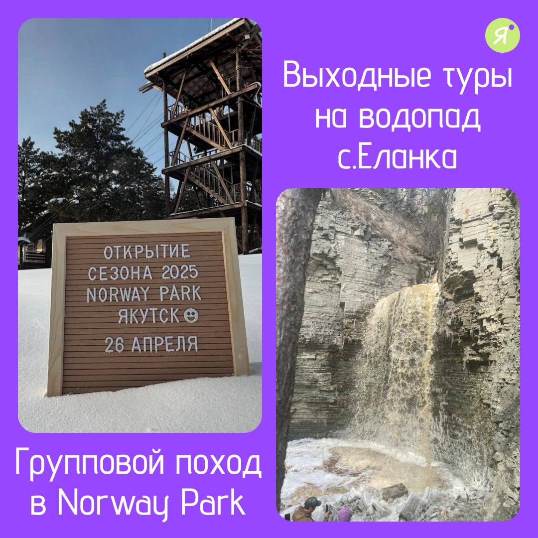 Активные выходные #ЗаГородом 🤩 Групповой поход в Norway Park 26 апреля | +7 924 767-69-04 🤩 Трассы для всех уровней: от новичков до профи. 🤩 Грандиозные виды на горы и свежий воздух. 🤩 Включен трансфер из Якутска + шашлыки после активного отдыха! 🤩 Возможность найти новых друзей и зарядиться адреналином. Стоимость участия: 1500 руб. — трансфер (туда-обратно) + шашлыки. 1800-2200 руб. – абонемент в парк 🤩 Выходные туры на водопад с.Еланка 26-27 апреля | +7 924 767-69-04 Водопад в живописном селе Еланка (152 км от Якутска) ждет тебя! 🌿💦 Его мощные потоки рождаются из талых снегов — зрелище, от которого захватывает дух! Программа дня: 09:00 — Сбор на автовокзале Якутска 09:30 — Выезд из Якутска 12:30— Прибытие в Еланку 13:00 — Сытный обед (берите с собой ланч-бокс + термос с чаем) 13:30 — Пеший поход к водопаду (2 км в одну сторону). Фотосессии, прогулка 14:00-16:00 — Исследуем окрестности, ловим радугу в брызгах и делаем кадры для Insta! 16:00 — Возвращение в Якутск. С