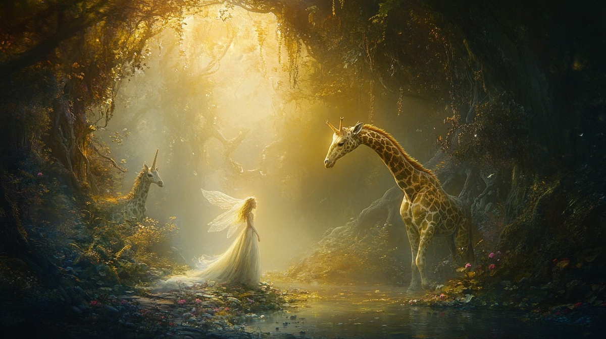 Создано на основе запроса: a fantasy scene of a fairy and a Giraffe unicorn Hybrid in an enchanted forest. ethereal, exquisitely detailed, and epic. a movie still, in the style of storybook fantasy art, Henry Roderick Newman, and James Wells Champney. --- Автоперевод: Фэнтезийная сцена феи и гирафского гибрида единорога в зачарованном лесу. Круто вышло? 🤔 https://dzen.ru/id/65c0c65c86e4f837c27b24d7 #ИИ #AI #нейросеть #midjourney #art
